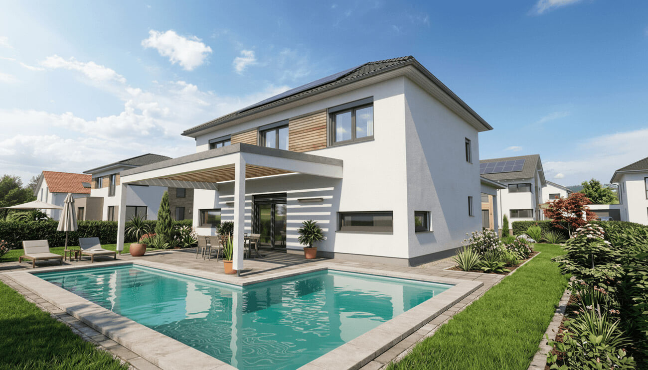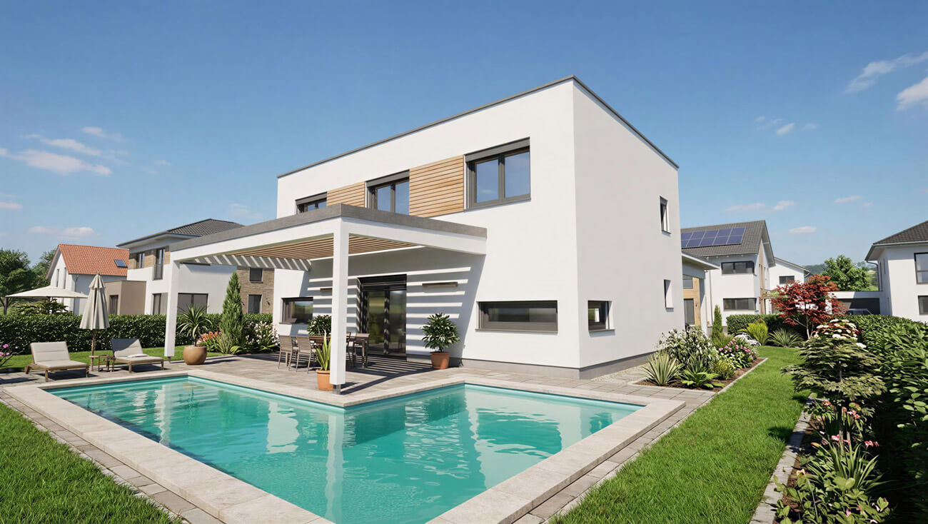Besonders flexibel zeigt sich das Design bei der Dachgestaltung: Ob klassisches Walmdach mit Photovoltaik-Option oder ein minimalistisches Flachdach im Bauhaus-Stil – das Individual Living 119 passt sich Ihrem persönlichen Geschmack und den örtlichen Gegebenheiten perfekt an. Der großzügige Außenbereich mit integrierter Pool-Landschaft und moderner Terrassenüberdachung erweitert den Wohnraum an warmen Tagen direkt ins Grüne.