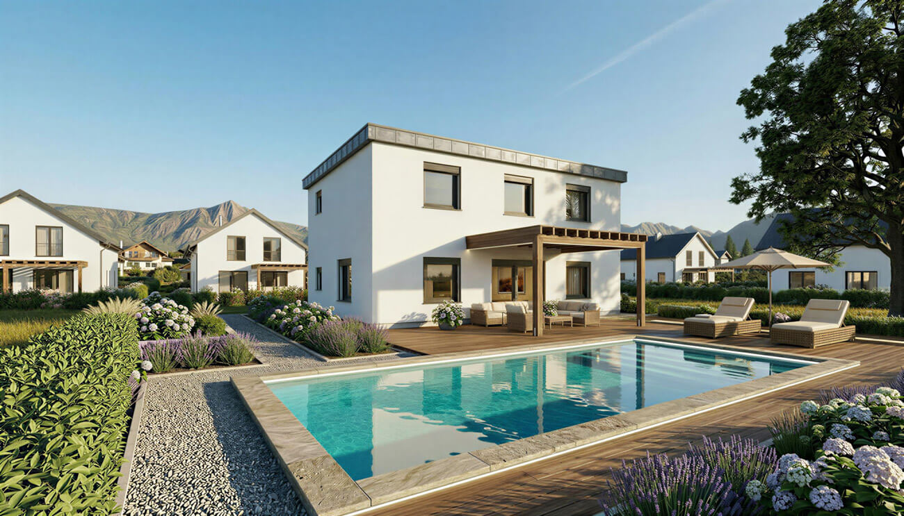 Die Architektur besticht durch ihre symmetrische Fensteranordnung und die Option zwischen einem gemütlichen Zeltdach oder einem modernen Flachdach-Design. Der großzügige Terrassenbereich mit Holzpergola schafft eine direkte Verbindung zwischen dem offenen Wohnbereich und dem Garten, was das Haus optisch vergrößert und ein Urlaubsgefühl im Alltag garantiert.